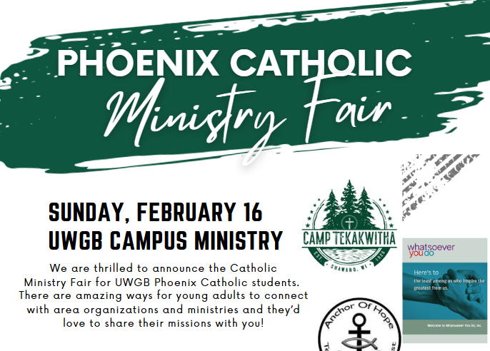We are thrilled to announce the CatholicMinistry Fair for UWGB Phoenix Catholic students. There are amazing ways for young adults to connect with area organizations and ministries and they’d love to share their missions with you!Sunday, February 16th6-7pm Ministry Fair7:00pm Mass with Students8-8:45pm Fellowship & Continued ConversationsLocation: The Mauthe Center 2418 Leon Bond Dr, Green Bay, WI 54311